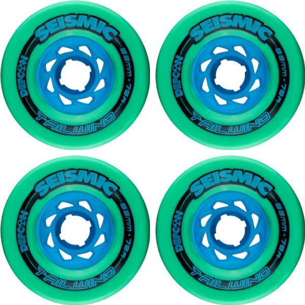 Love to cruise? These brand new Seismic wheels are built to last! Measuring 83mm in diameter and 79a in hardness, they pack a super smooth ride. Over gravel or while you film that dope skate video that'll put you on the map (go ahead - all of us at Warehouse Skateboards will wait), these softer wheels help you dominate like a smooth operator. Seismic Skate Systems Tailwind Mint / Blue Skateboard Wheels - 79a are sold in (1) set of four (4) wheels.